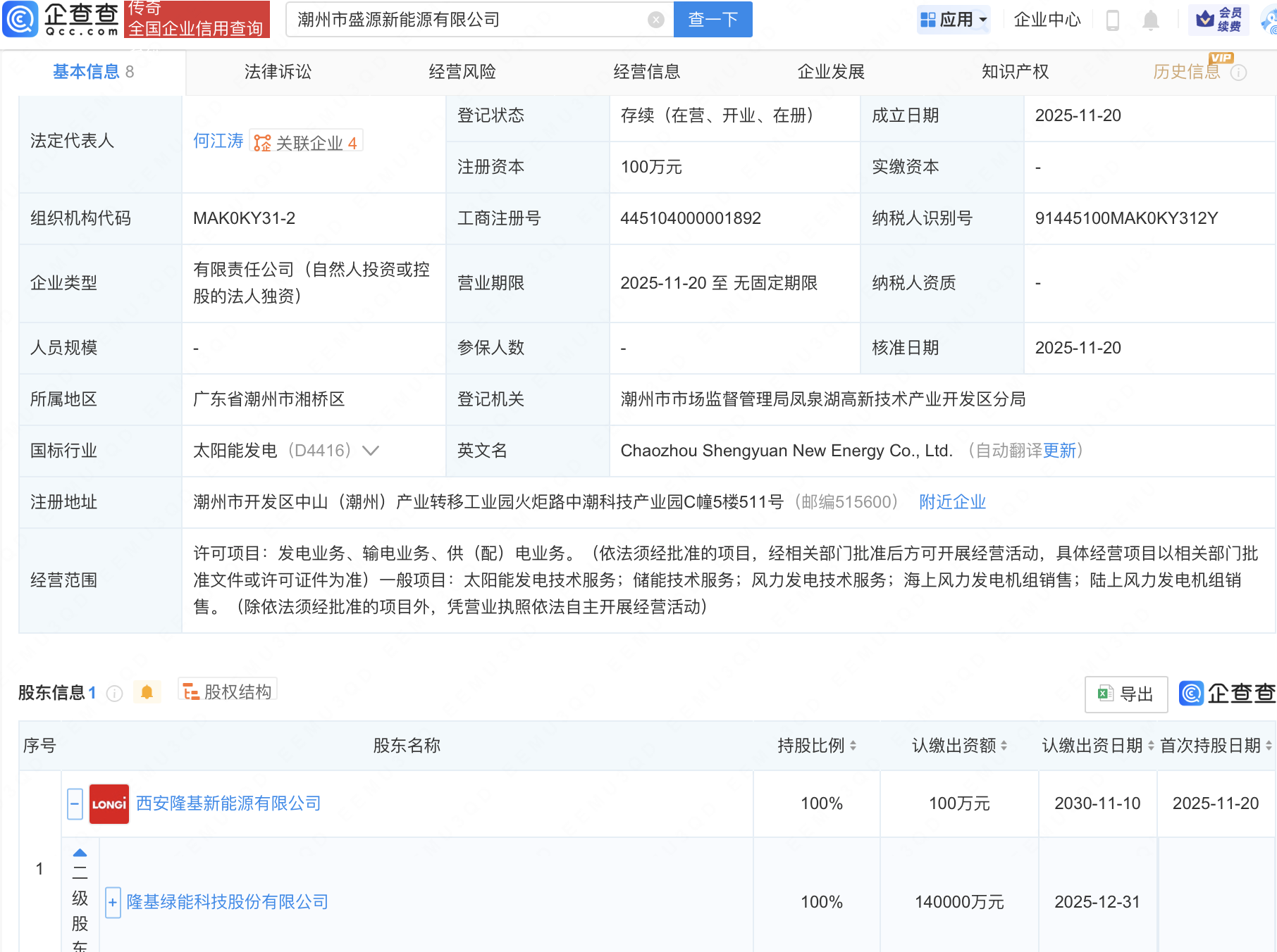 近日,潮州市盛源新能源有限公司成立,经营范围包含:太阳能发电技术服务;储能技术服务;风力发电技术服务;海上风力发电机组销售等。企查查股权穿透显示,该公司由隆基绿能(601012)间接全资持股。